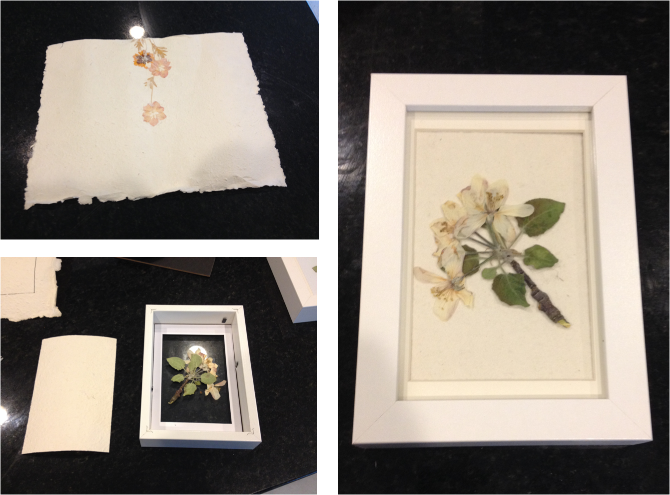I grabbed two of my favorite Ikea Ribba frames, and some leftover hand-made paper I had from these large pressed flower prints my mom let me have, and voila….two wonderful remembrances of our little apple tree!